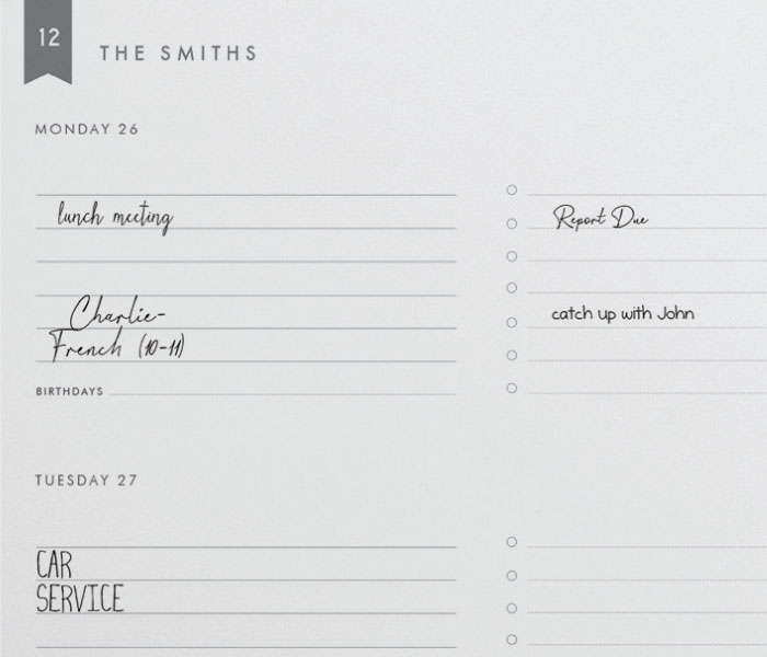 • The traditional weekly diary view. Days of the week are split between the page spread. Each day contains space for general notes, a checklist column and a dedicated birthday field.